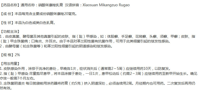 【药品名称】通用名称:硝酸咪康唑乳膏 汉语拼音:Xiaosuan Mikangzuo Rugao